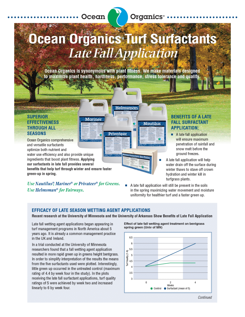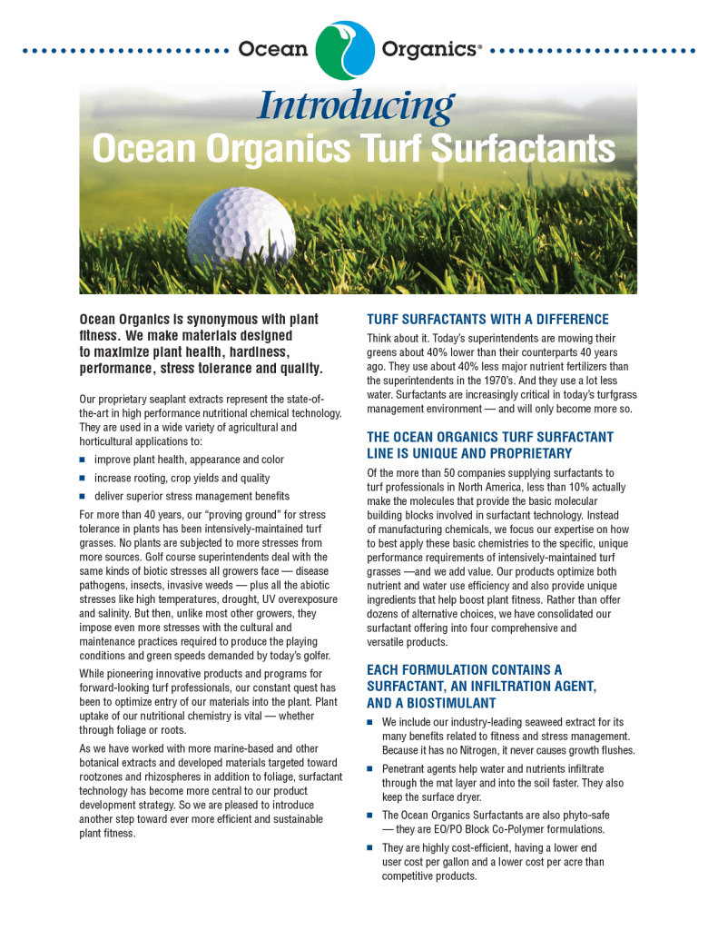 But, unlike most other growers, they impose even more stresses with the cultural and maintenance practices required to produce the playing conditions and green speeds demanded by today’s golfer. Plant uptake of our nutritional chemistry is vital, whether through foliage or roots. As we have worked with more marine-based and other botanical extracts and developed materials targeted toward rootzones and rhizospheres in addition to foliage, surfactant technology has become more central to our product development strategy.